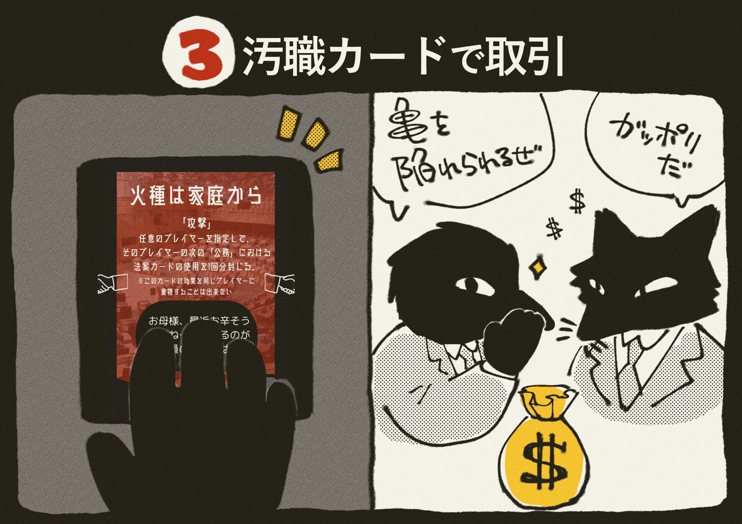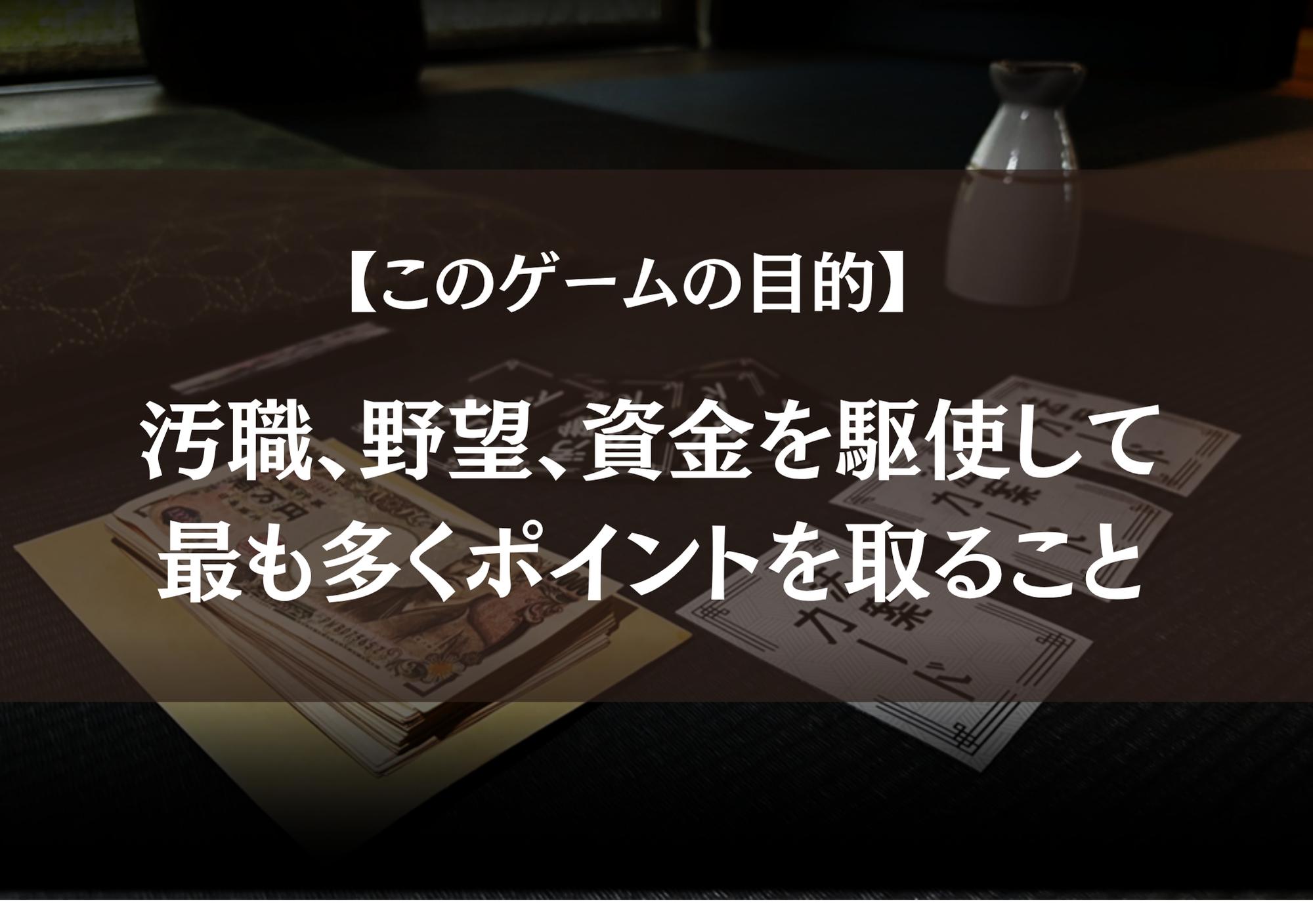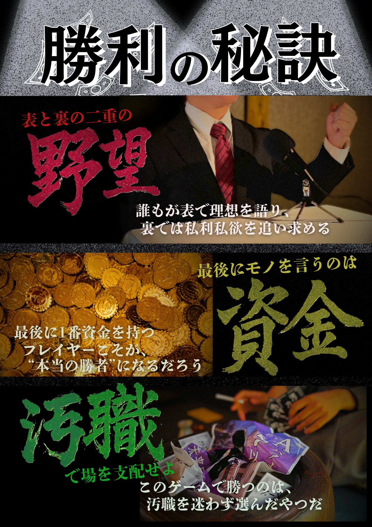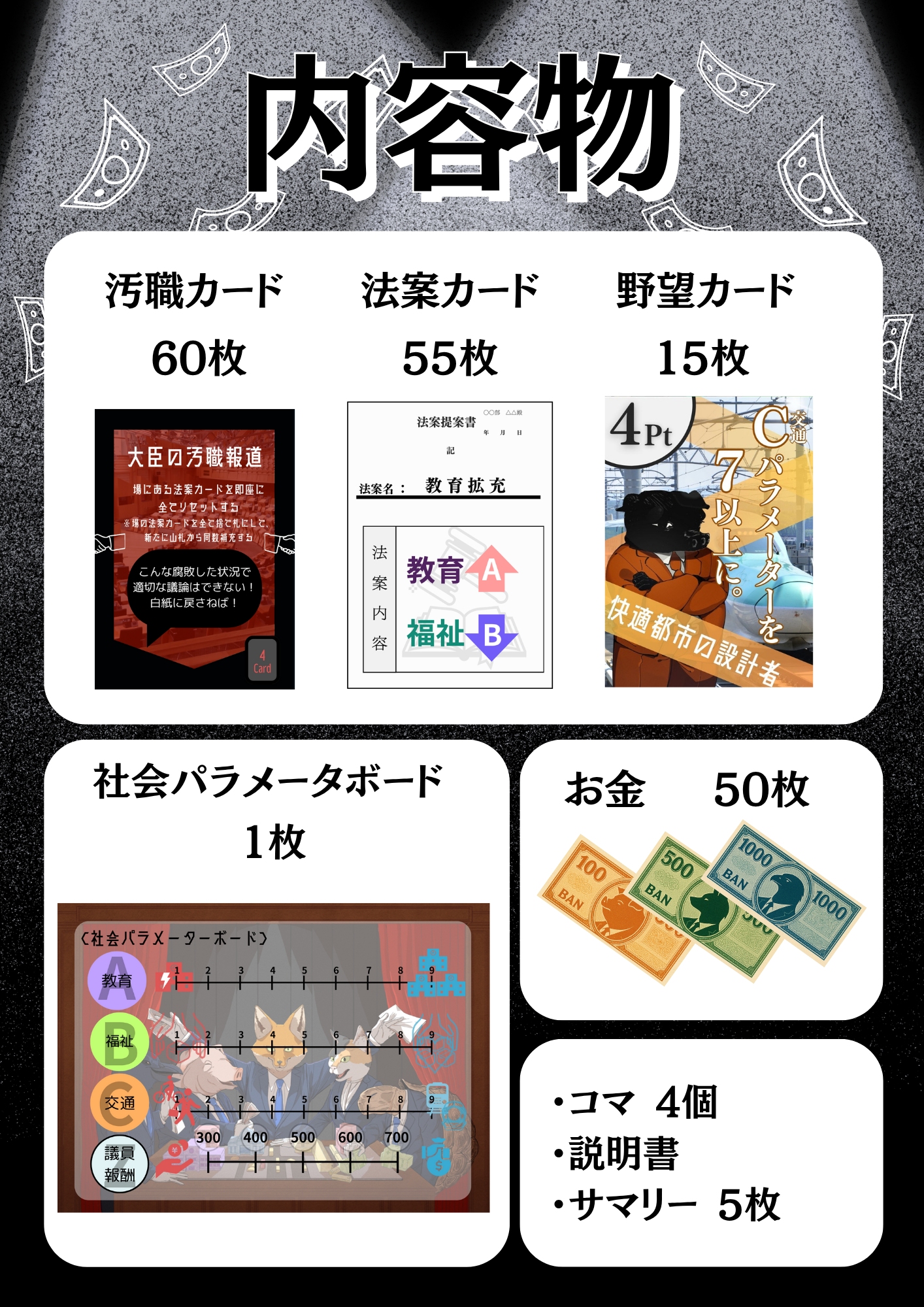 内容物:汚職カード60枚、法案カード55枚、野望カード15枚、社会パラメータボード1枚、お金50枚、コマ4個、説明書、サマリー10枚