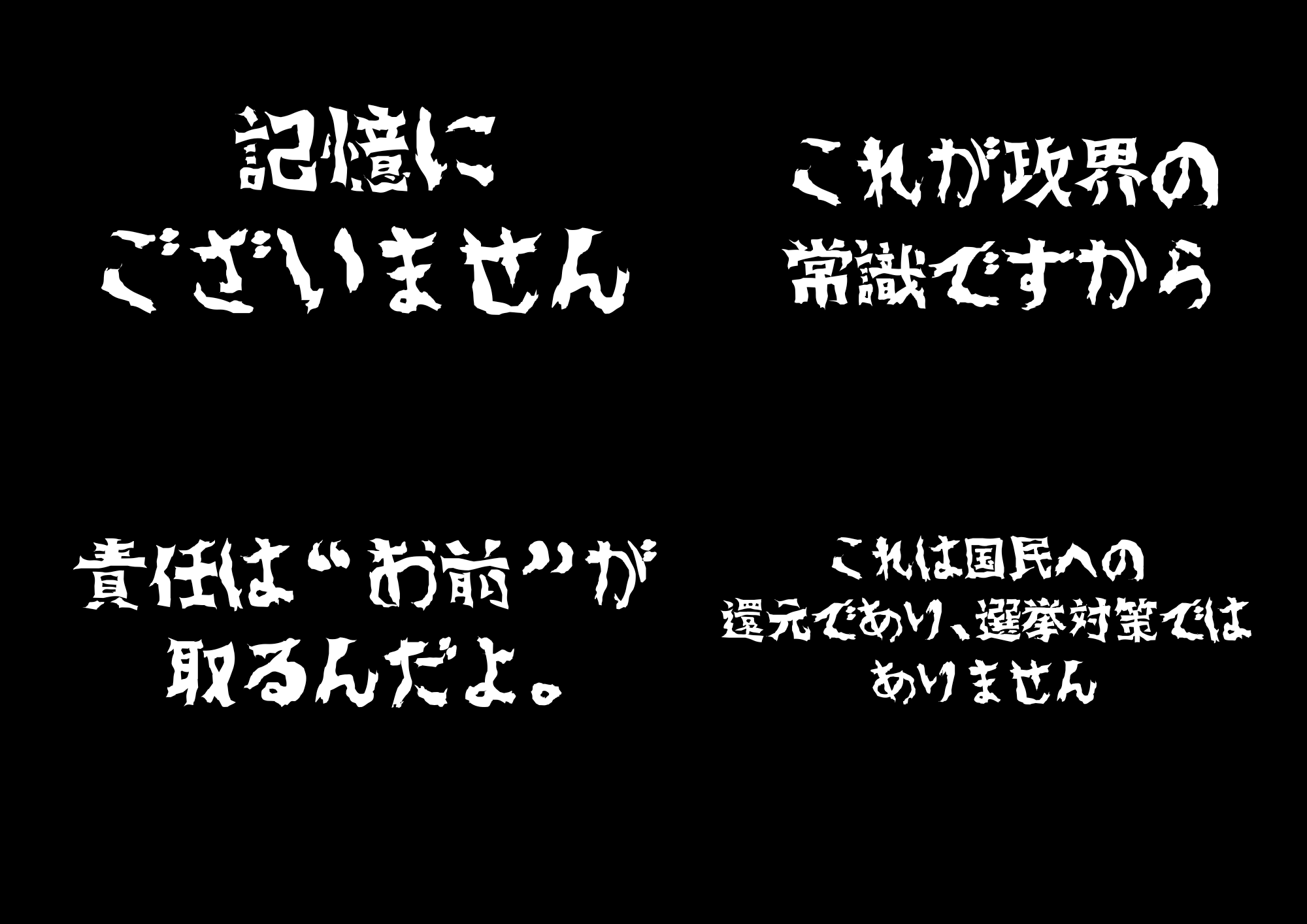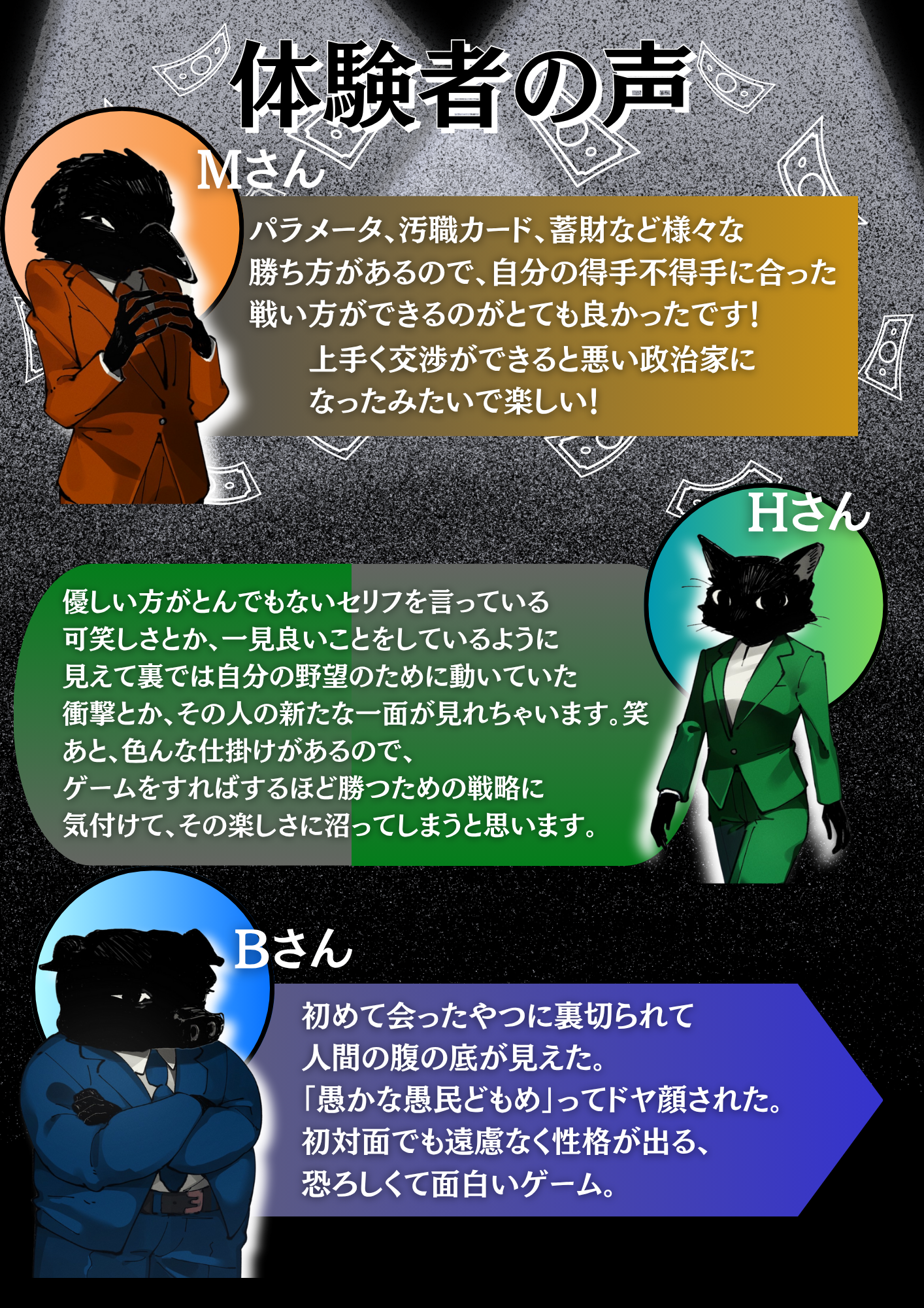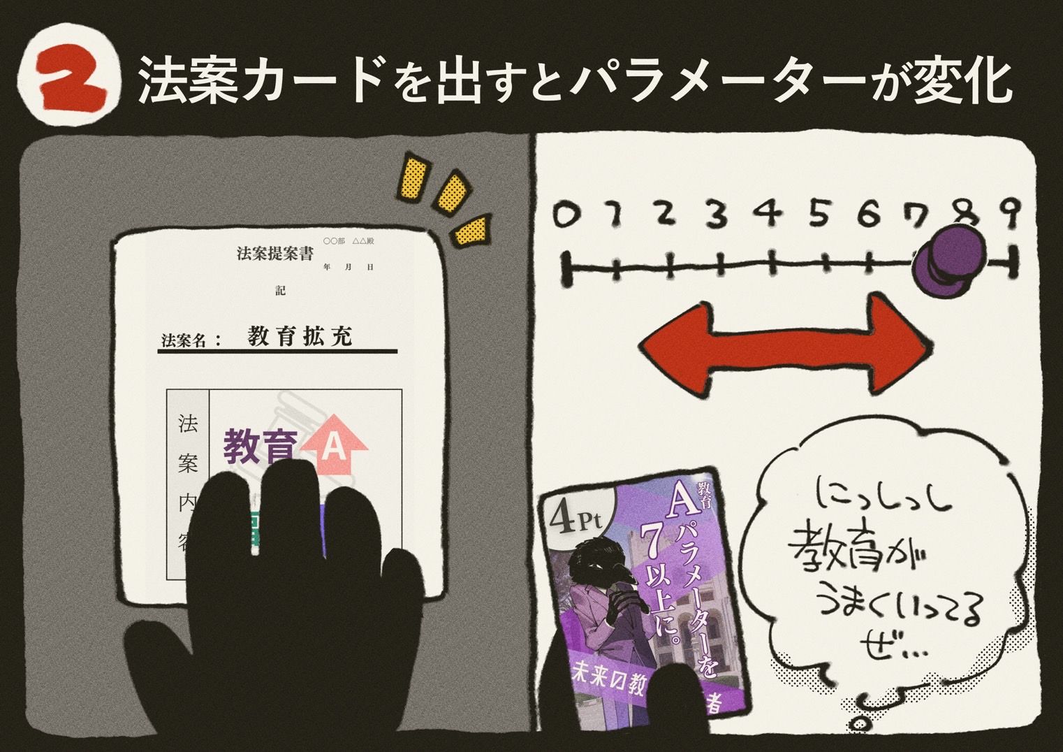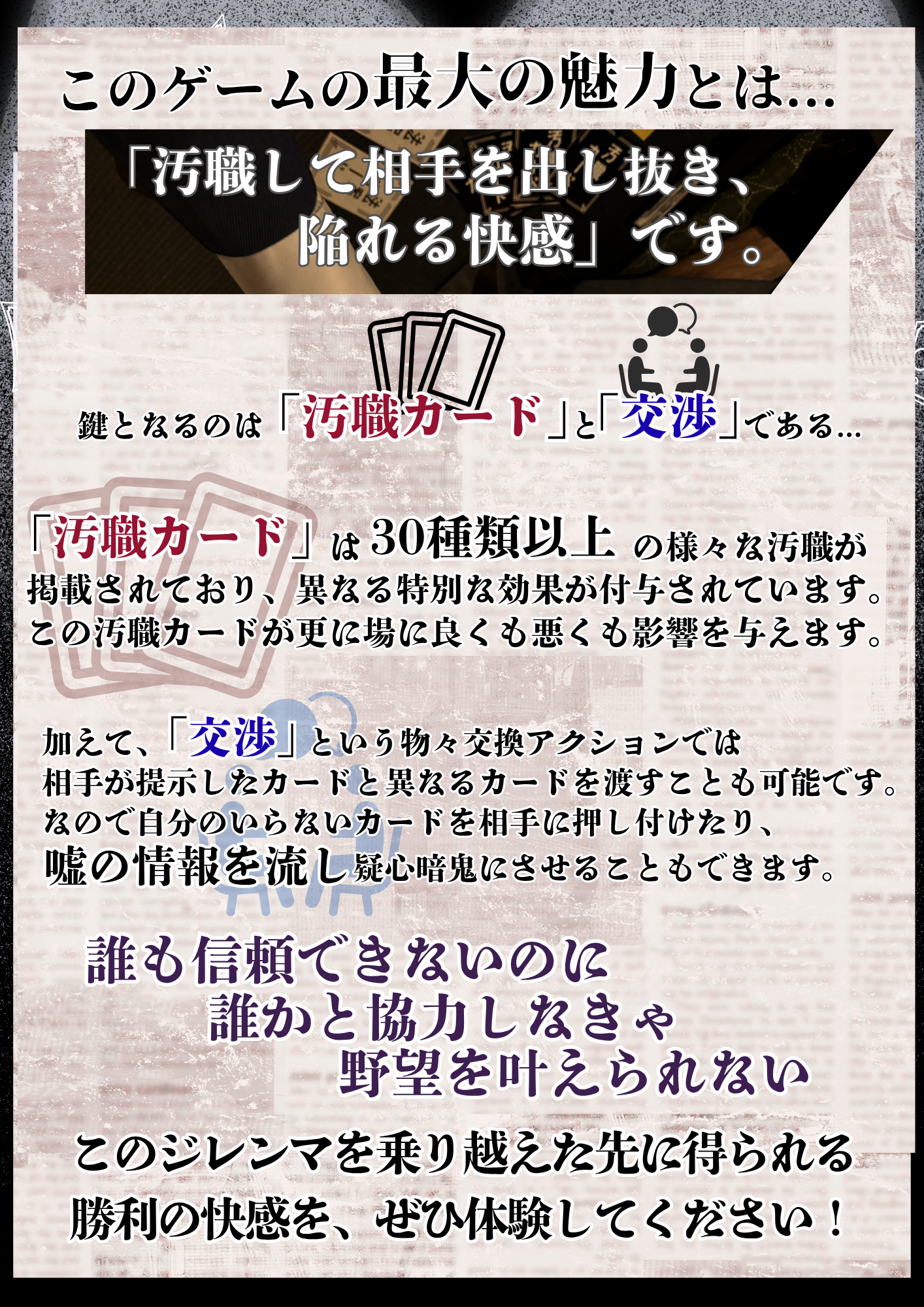 内容物:汚職カード60枚、法案カード55枚、野望カード15枚、社会パラメータボード1枚、お金50枚、コマ4個、説明書、サマリー10枚